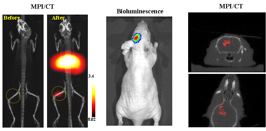 今年二月份,宋国胜教授与斯坦福大学饶江宏教授合作,通过系统的研究获得了影响磁性粒子成像信号的作用规律和关键原理,开发了新型磁性粒子探针---FeCo合金粒子,并首次应用于磁性粒子成像(MPI)。该造影剂在极低含量时(5 ng)仍具有很强的造影效果。这意味着,未来在进行人体成像时,可以使用更小剂量的造影剂,从而避免高剂量造影剂引起的肾肝损伤。基于MPI的直接成像原理,我们可以对造影剂进行正相和无背景干扰的活体成像,极大地提高信噪比。这项技术为肿瘤早期诊断、癌细胞示踪、脑中风、药物输送治疗、肺部灌注成像、胃肠出血、神经退行性疾病、磁热治疗等在活体中的可视化研究,提供了强有力的手段。相关研究成果以H视频