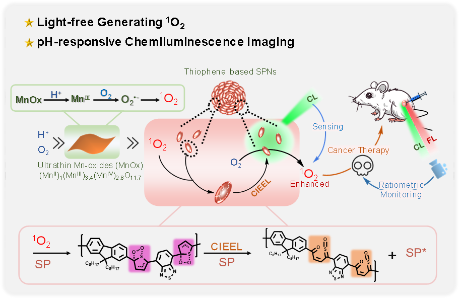 论文信息:Lu C., Song G.*, et al,Light-free Generation of Singlet Oxygen through Manganese - Thiophene Nanosystems for pH-responsive Chemiluminescence Imaging and Tumor Therapy,Chem, 2020, DOI,10.1016/j.chempr.2020.06.024