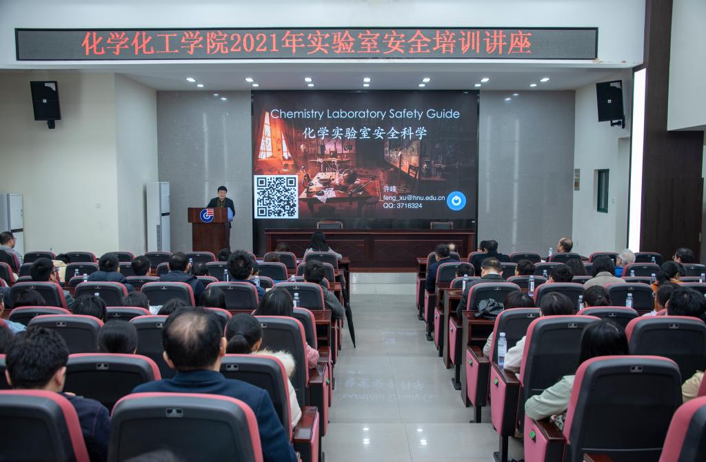 在新化工楼D区报告厅组织开展实验室安全培训讲座。本次讲座邀请学院多年为学生讲授《化学实验室安全技术》和《化学实验室安全科学》的许峰副教授主讲,学院全体教职工参与学习。