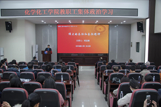 于新化工楼D区报告厅开展了2021年第七次全体教职工集中政治学习。本次集中学习主讲嘉宾为化学系第二党支部书记刘志刚,授课主题为《伟大的长征和长征精神》,学院全体教职工参与学习。