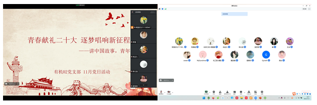 2022年11月3日,有机02党支部以微党课的形式展开活动,焦景超同志对党的二十大报告进行了重点解读,带领大家回顾了新时代以来我国的伟大成就及我党波澜壮阔的发展历程,对党的二十大精神及伟大的建党精神进行了深入学习。随后支部成员就新时代该如何贯彻落实党的二十大精神及建党精神进行了积极学习和热烈讨论。