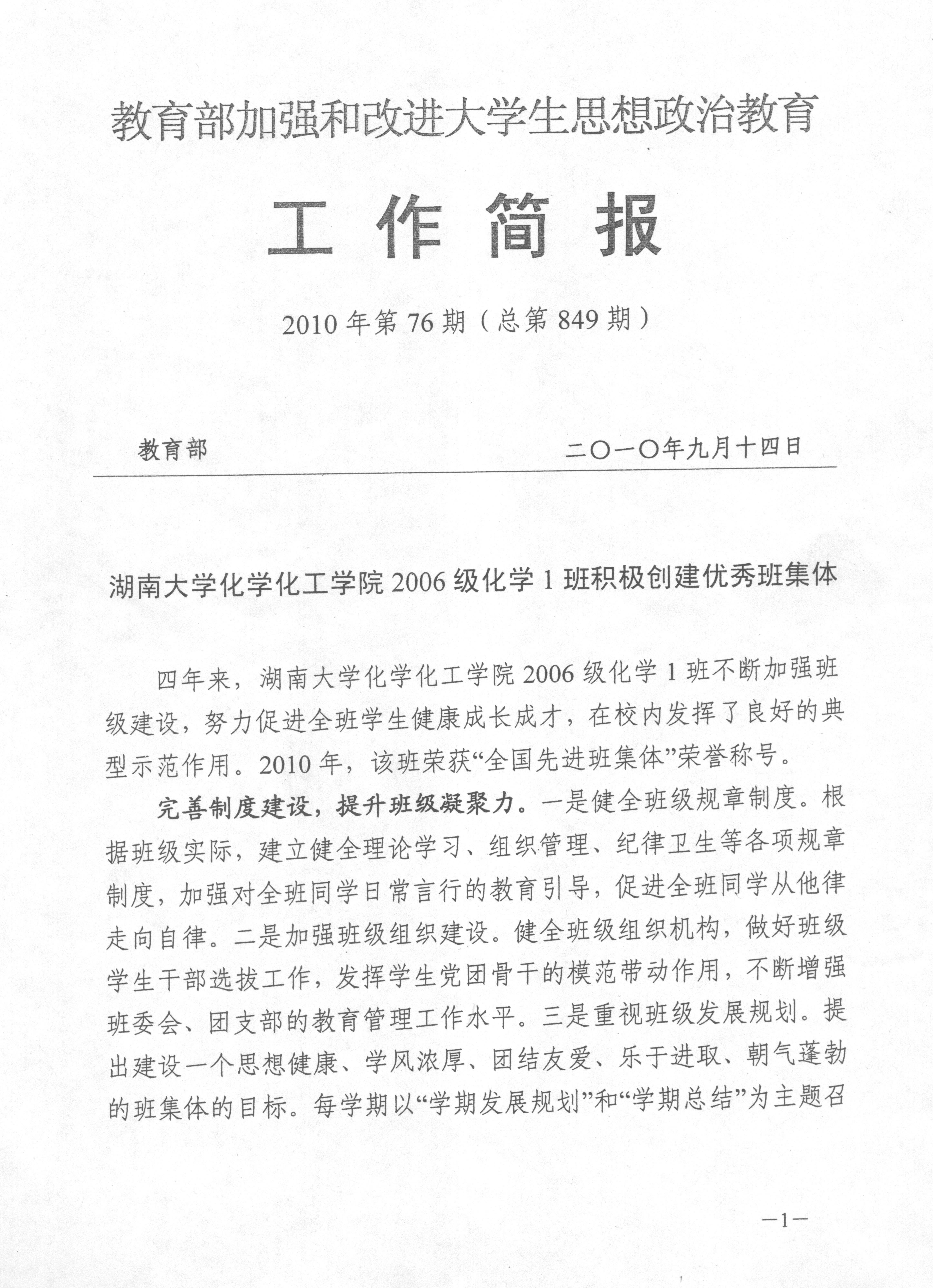 教育部工作简报:H视频 2006级化学1班积极创建优秀班集体