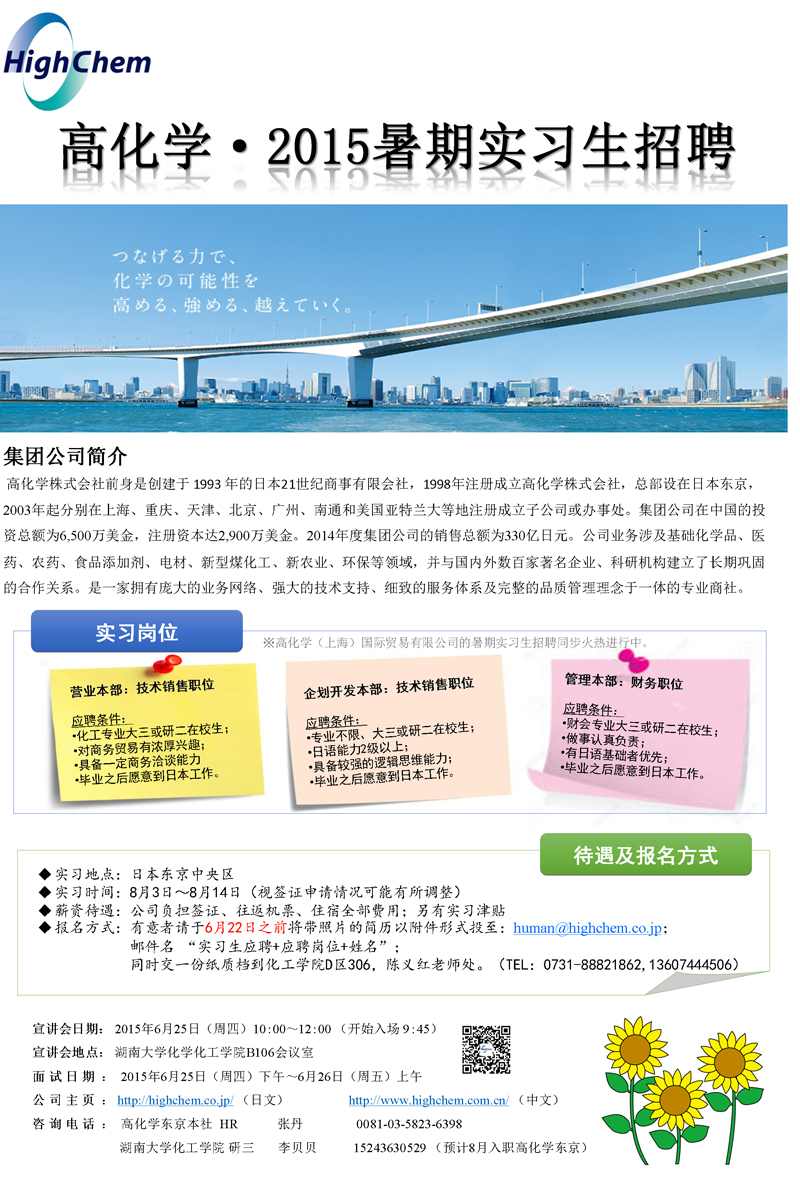 高化学2015年暑期实习生招聘公告