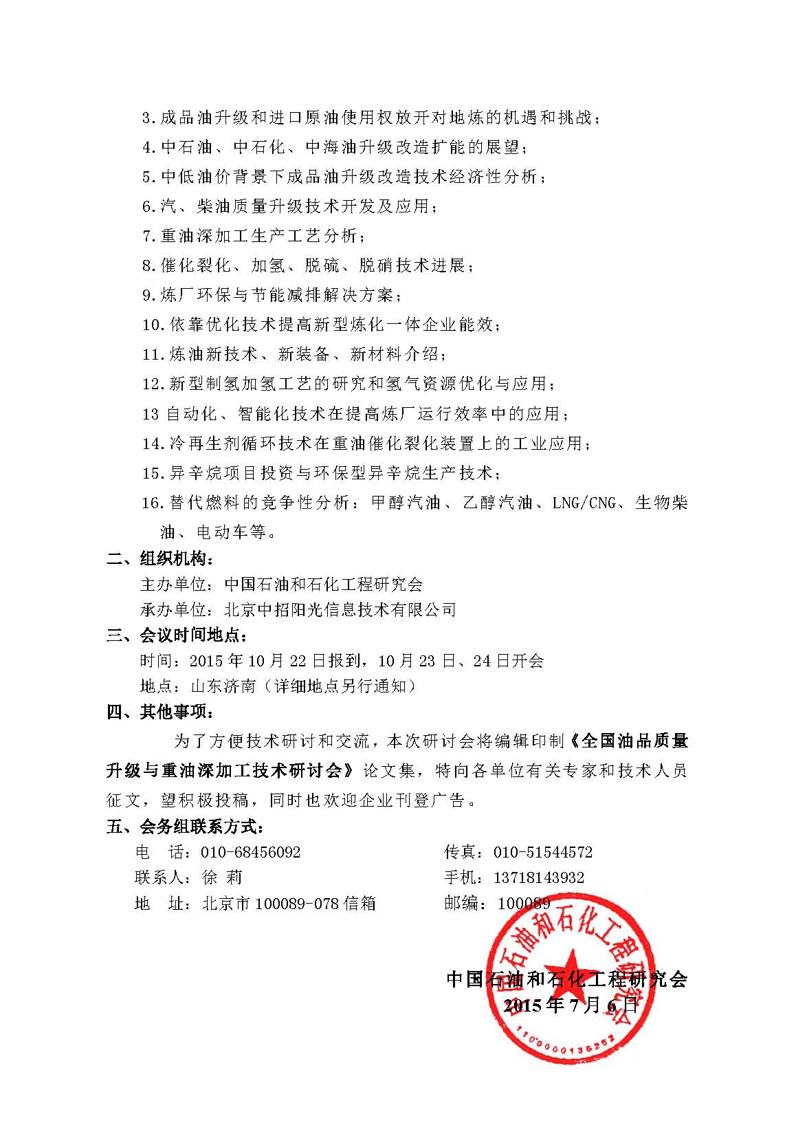 全国油品质量升级与重油深加工技术研讨会通知