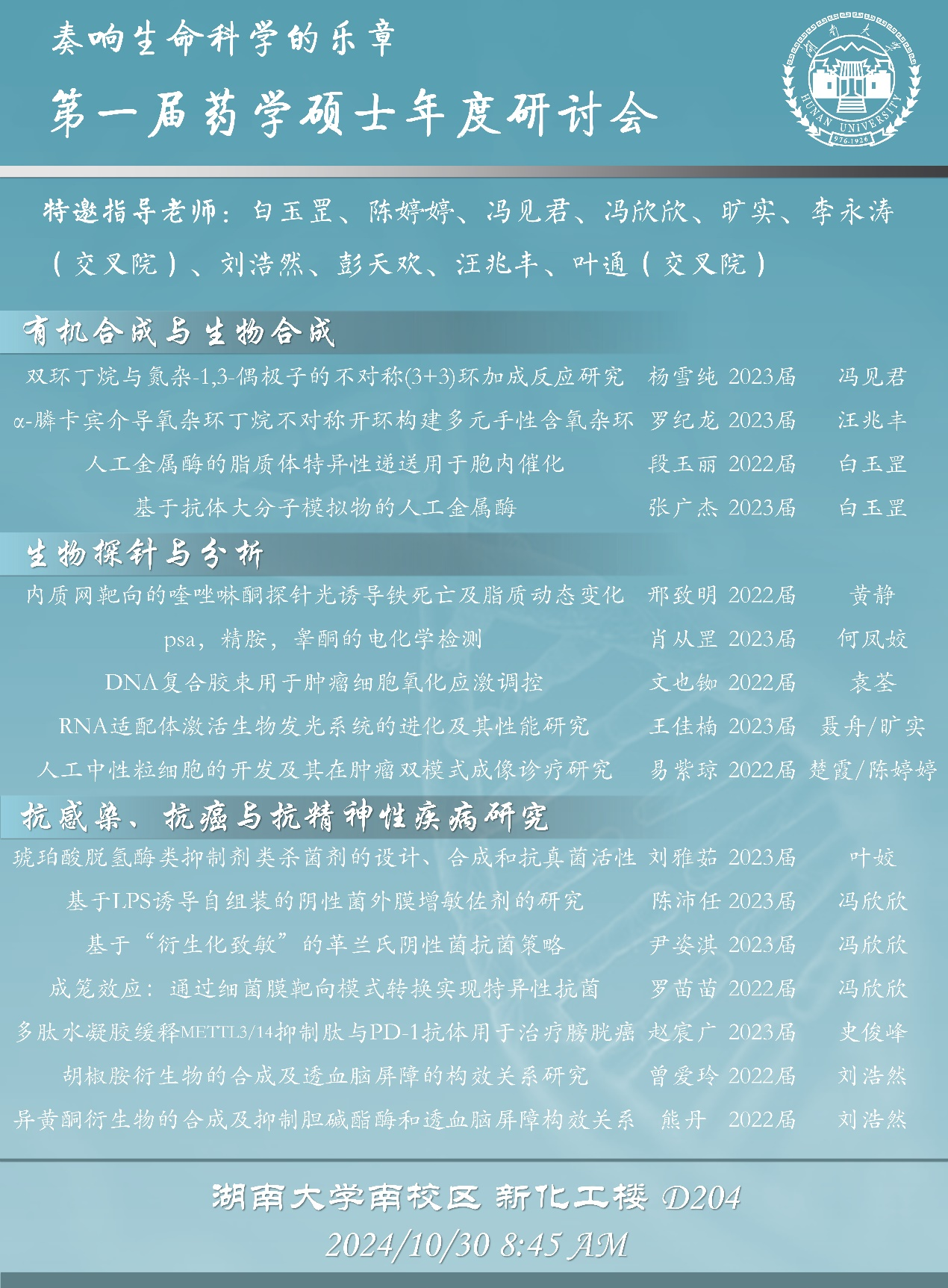 在化工院D栋成功举办了首届药学硕士年度研讨会。会议由学院药学学科负责人冯欣欣老师主持,邀请了白玉罡、陈婷婷、冯见君、旷实、刘浩然、彭天欢、汪兆丰及生命医学交叉研究院的李永涛、叶通等多位教师指导。此次活动吸引了2022级和2023级硕士研究生踊跃参与,报名率分别达到60%和47%,充分展现了药学硕士研究生的科研热情。