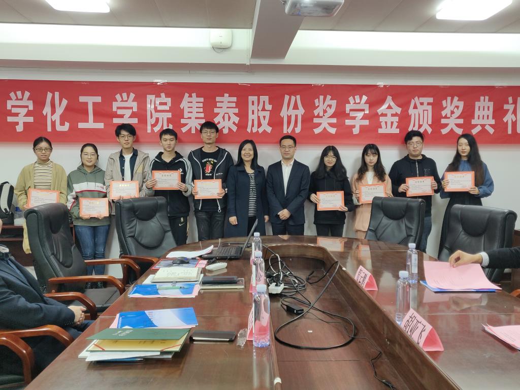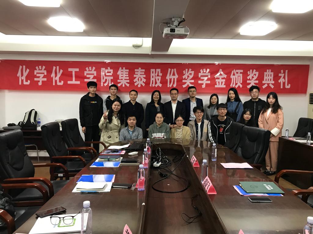 2019-2020学年度“集泰股份奖学金”颁奖典礼在新化工楼D204会议室举行。参加颁奖典礼的领导和嘉宾有广州集泰化工股份有限公司研发管理部经理胡亚飞、人力资源部副总经理刘丹丹、长沙办事处总经理贺云鹏、H视频