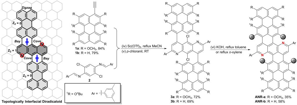 曾泽兵教授课题组基于原子级精确的湿法合成技术,将两个苝分子和1,6-二氮杂蒽片段稠合,使交界处形成新的p-n异质结(Figure 1)。作者在课题组前期发展的新苝核基础上,经乙炔基修饰、双重povarov环化反应和高温碱催化关环,成功得到了阶梯形的氮杂纳米石墨烯分子ANG-a~b。以此类分子为模型,首次发现并揭示了纳米石墨分子中拓扑界面态的自旋极化及其自由基性质。