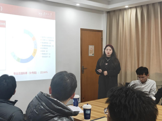 本科2023级辅导员南彬、本科2022级辅导员何妮翰分别对2023级、2022级2023-2024学年学习成绩和2024-2025学年秋季学期期中考试成绩进行分析。本科2022级辅导员何妮翰基于往届数据分享了学生未来发展规划的可能,介绍了研究生支教团、国优计划、卓越工程师计划的专项推免计划,总结了部分院校夏令营的特殊报名要求,分析了往届推免、考研、出国出境留学的情况,希望与班主任、班委信息共享,共同助力学生成长和发展。