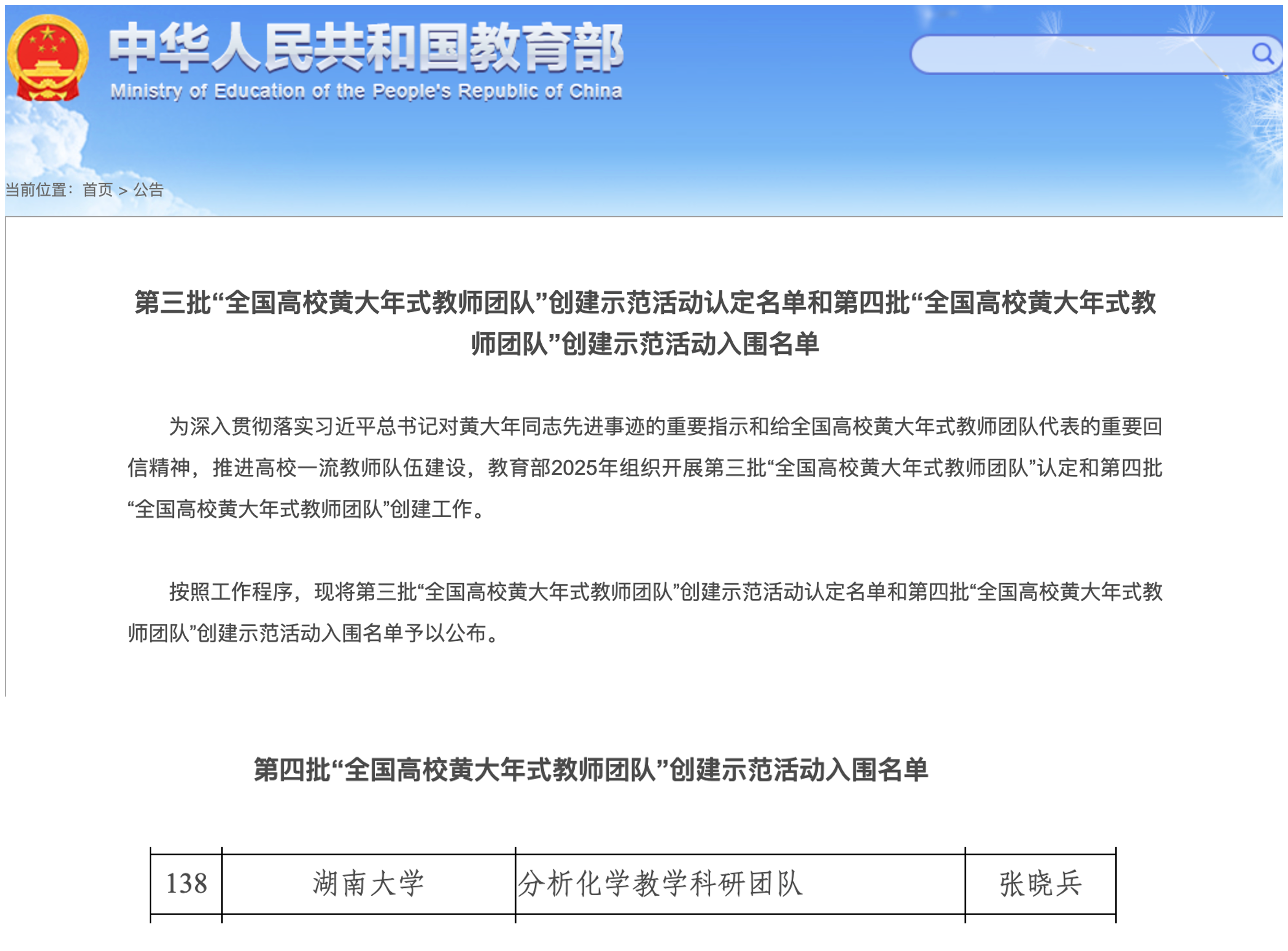 近日,教育部公布了第四批“全国高校黄大年式教师团队”入围名单,张晓兵教授领衔的分析化学教学科研团队成功入选。这是H视频